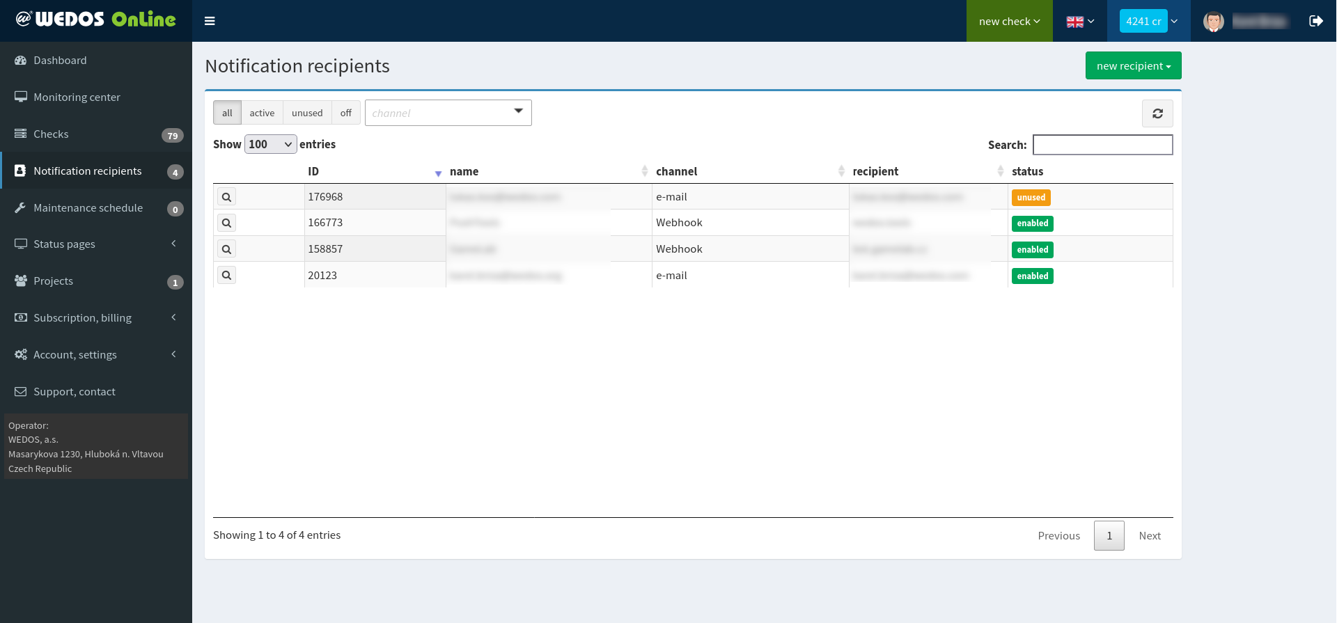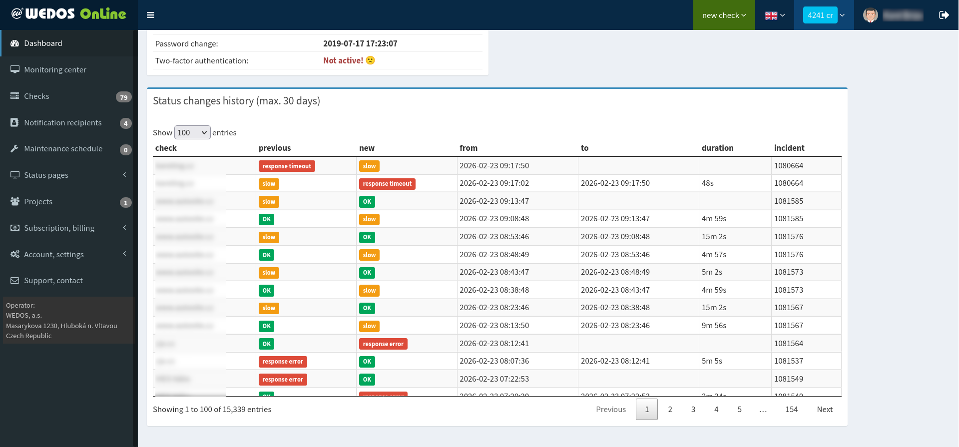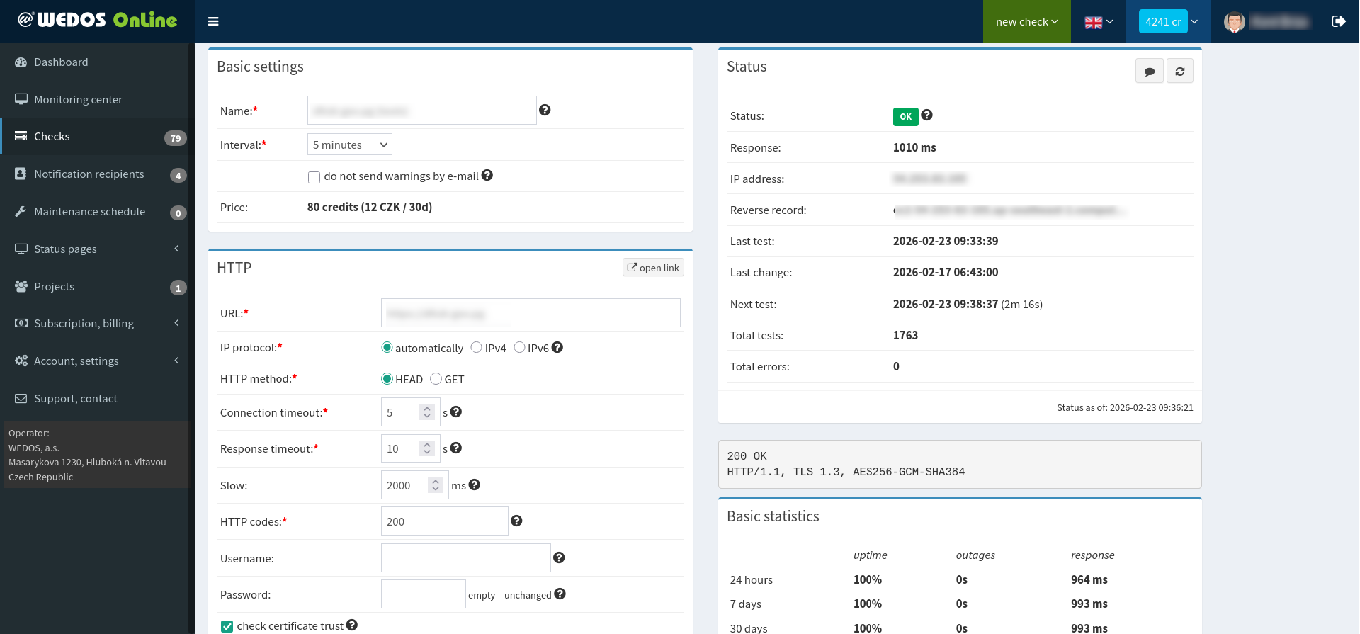 WEDOS OnLine korzysta z prostego i przejrzystego modelu opartego na kredytach dla wszystkich kontroli. Każda kontrola jasno pokazuje koszt w kredytach, obliczany na podstawie typu kontroli, interwału oraz ewentualnych dodatkowych usług. Rozliczenia są wystawiane miesięcznie — i tylko za kredyty, które faktycznie zostały wykorzystane.